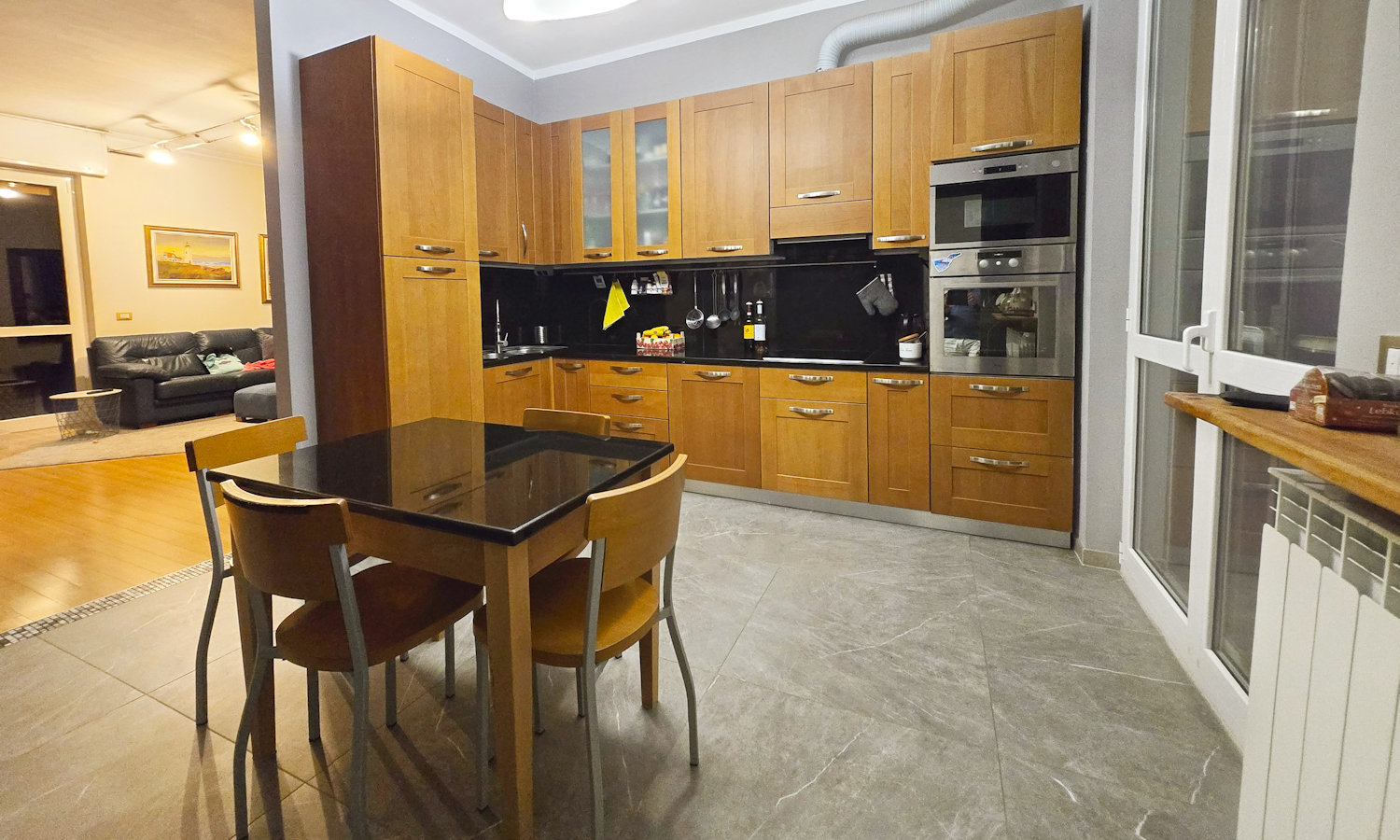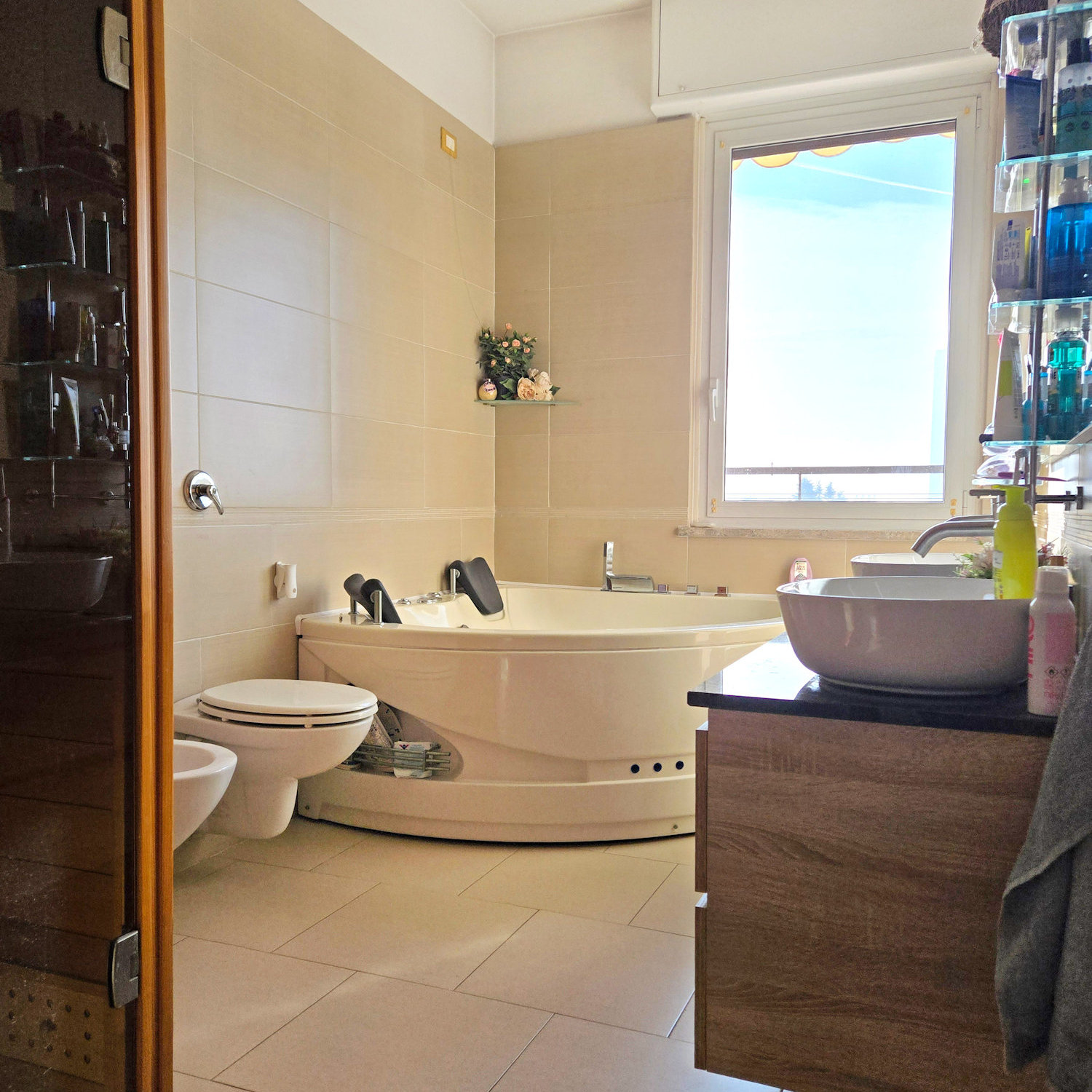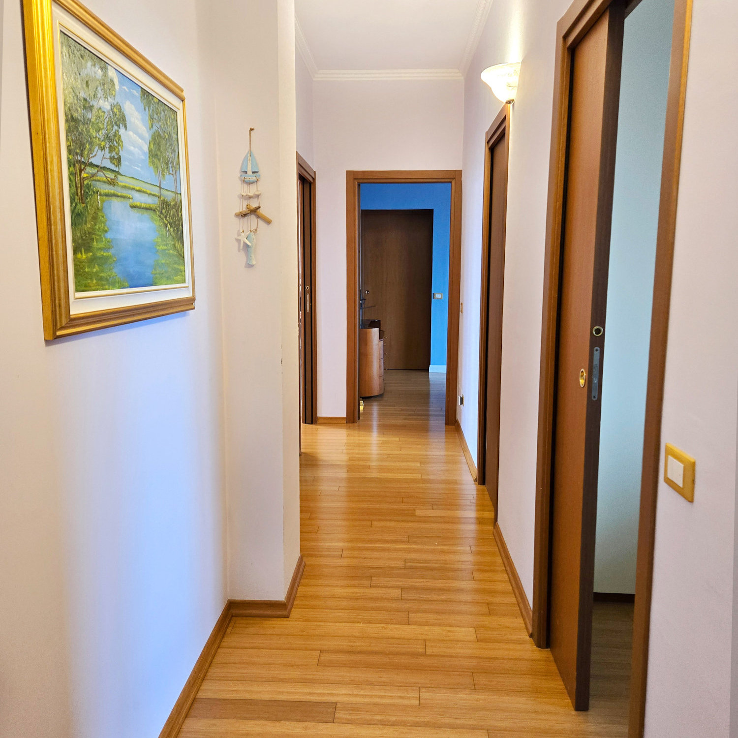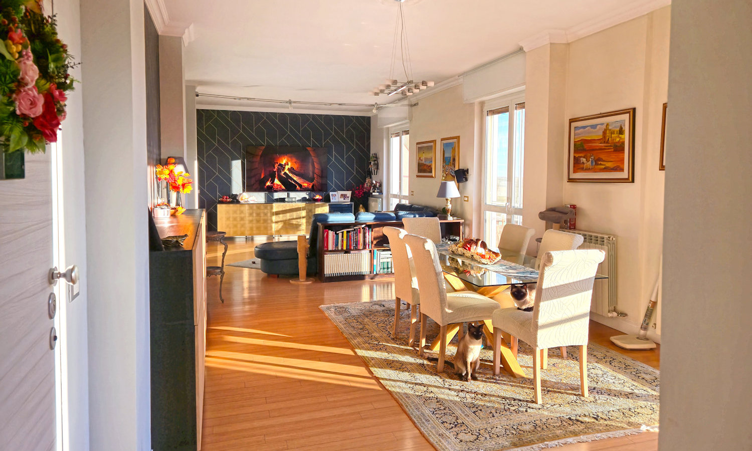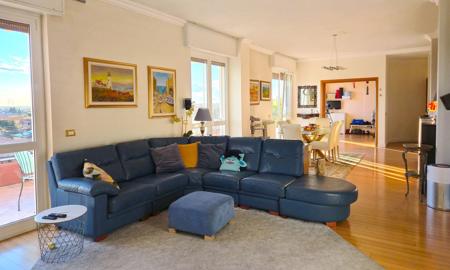 5 ampie stanze, doppio soggiorno, cucina abitabile, 3 bagni, 2 cabine armadio, sottotetto ripostiglio, 3 terrazzi e cantina.