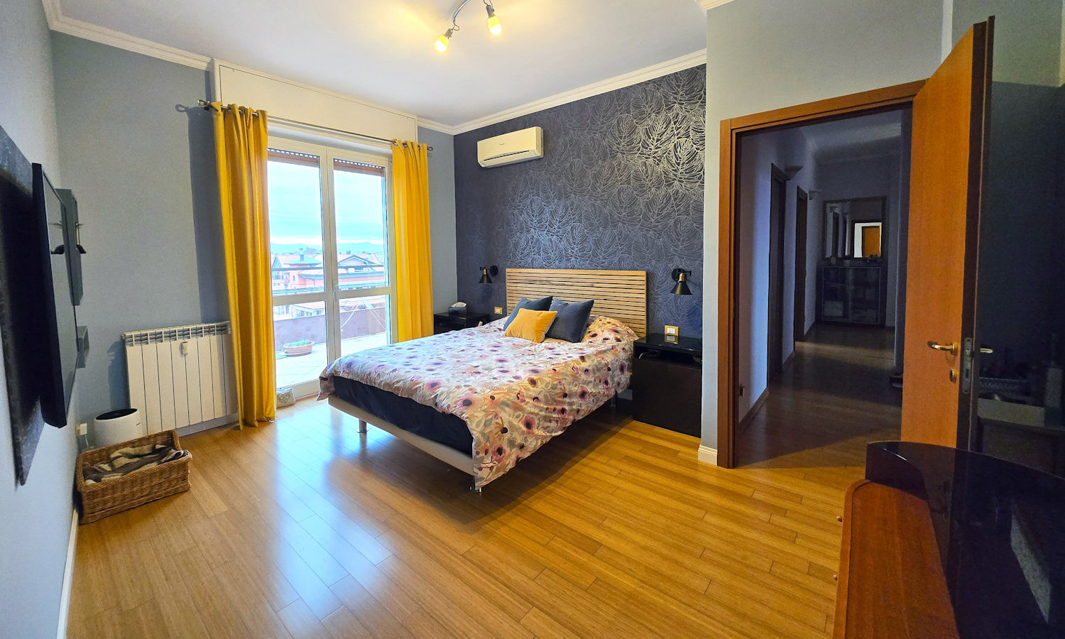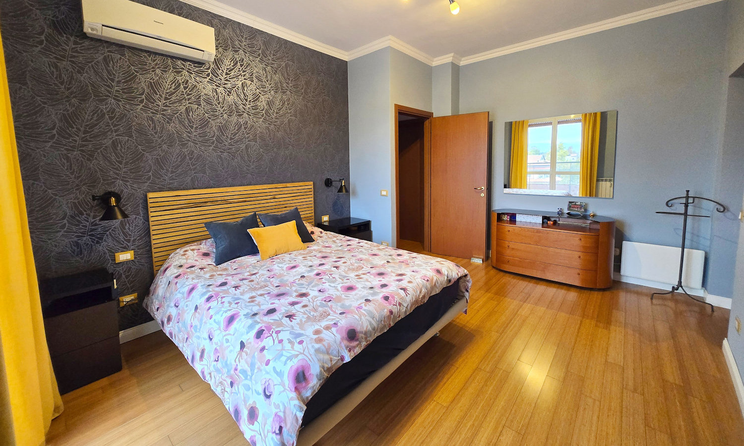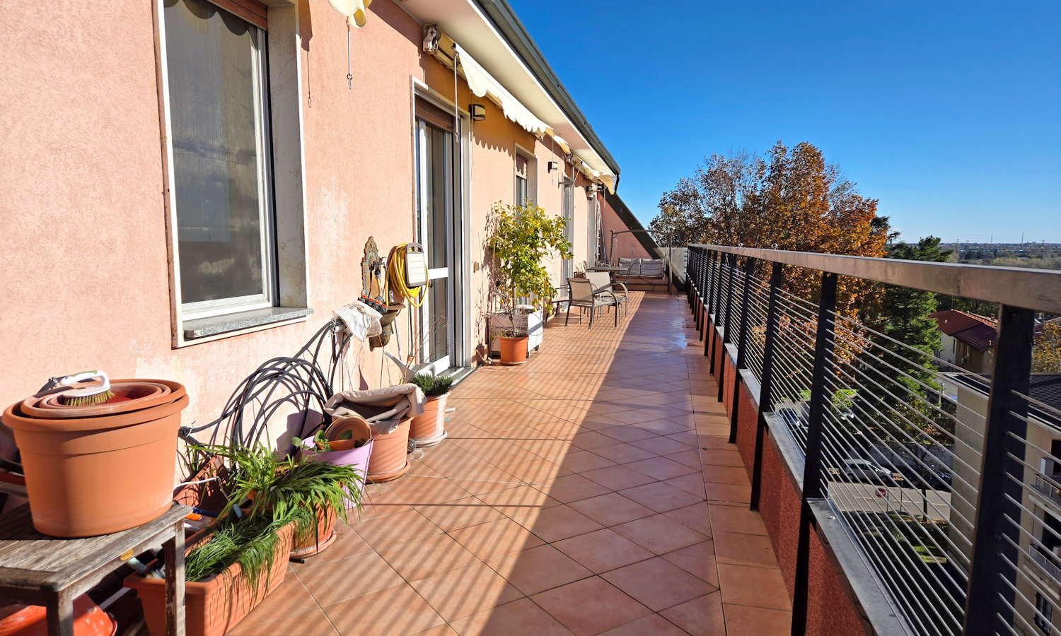 5 ampie stanze, doppio soggiorno, cucina abitabile, 3 bagni, 2 cabine armadio, sottotetto ripostiglio, 3 terrazzi e cantina.