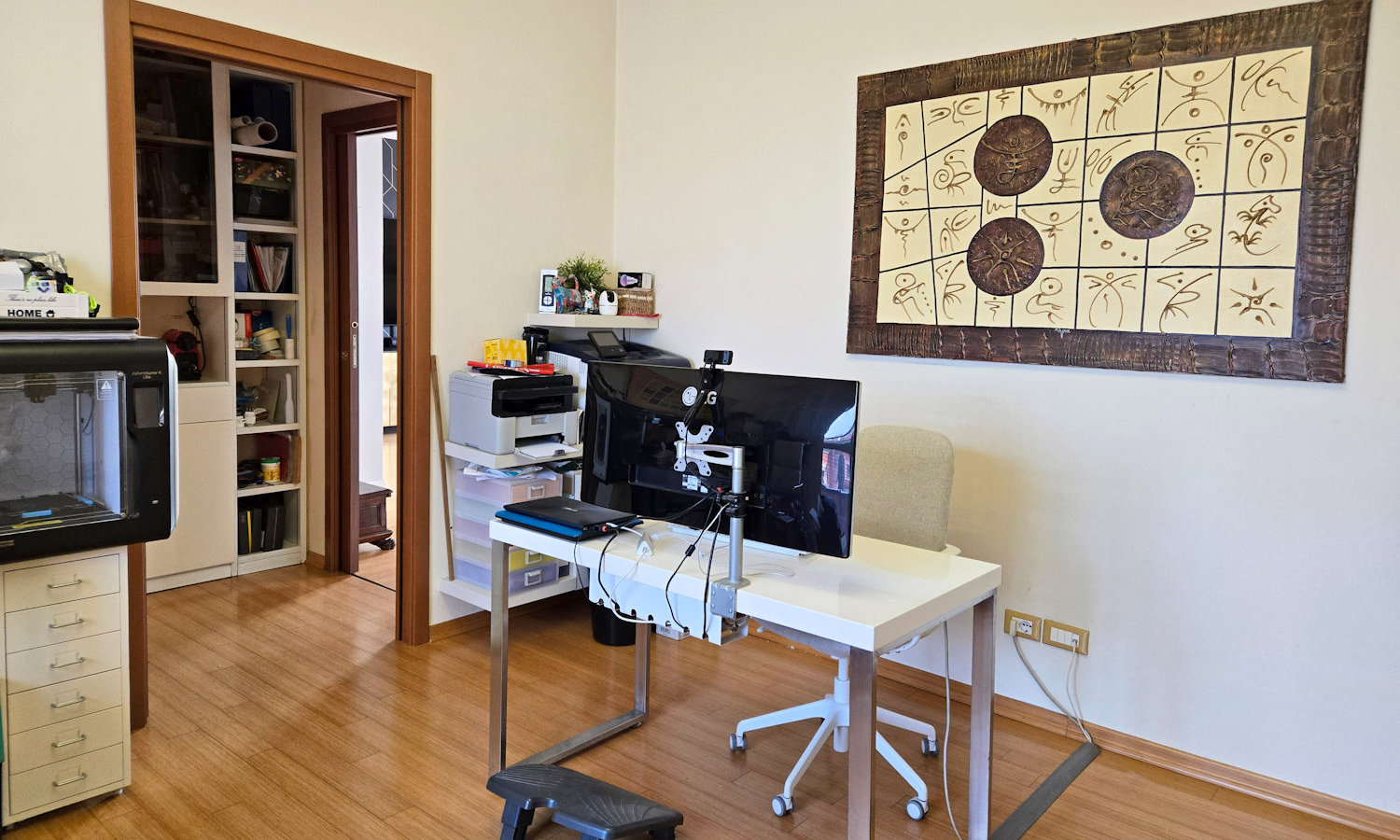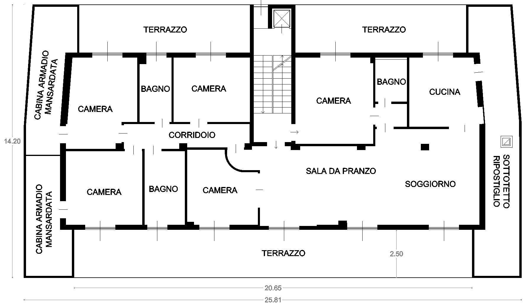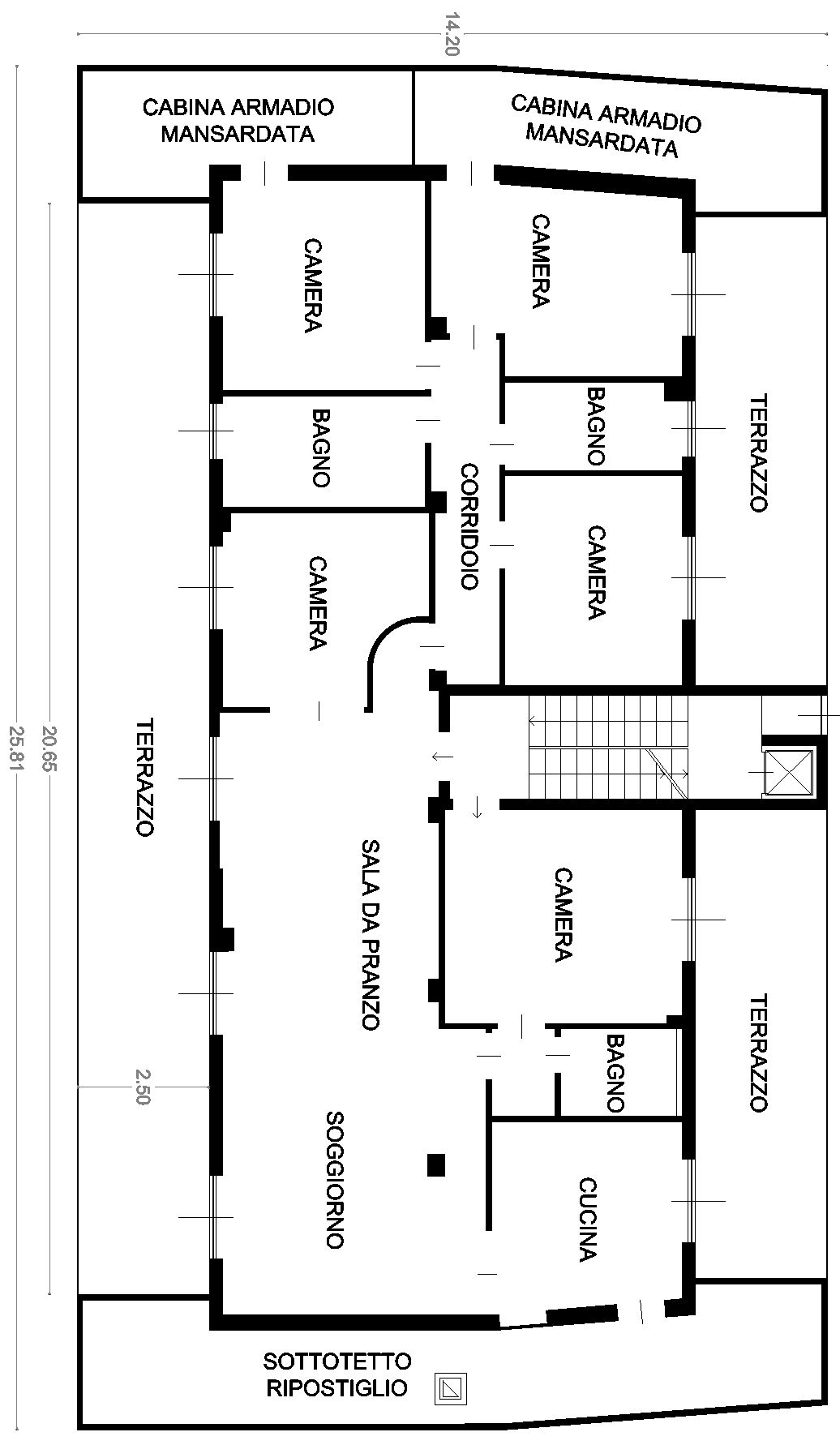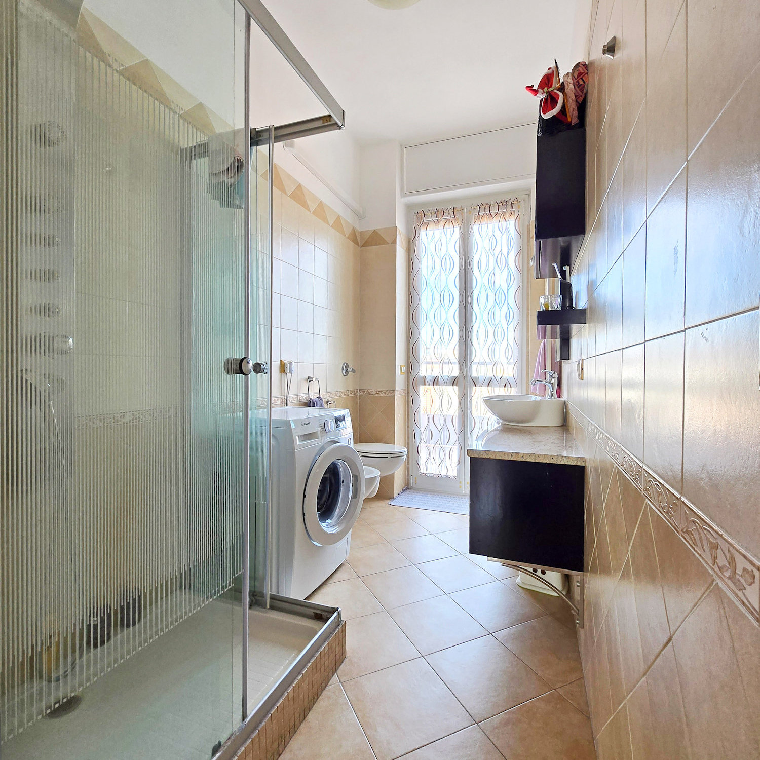 5 ampie stanze, doppio soggiorno, cucina abitabile, 3 bagni, 2 cabine armadio, sottotetto ripostiglio, 3 terrazzi e cantina.